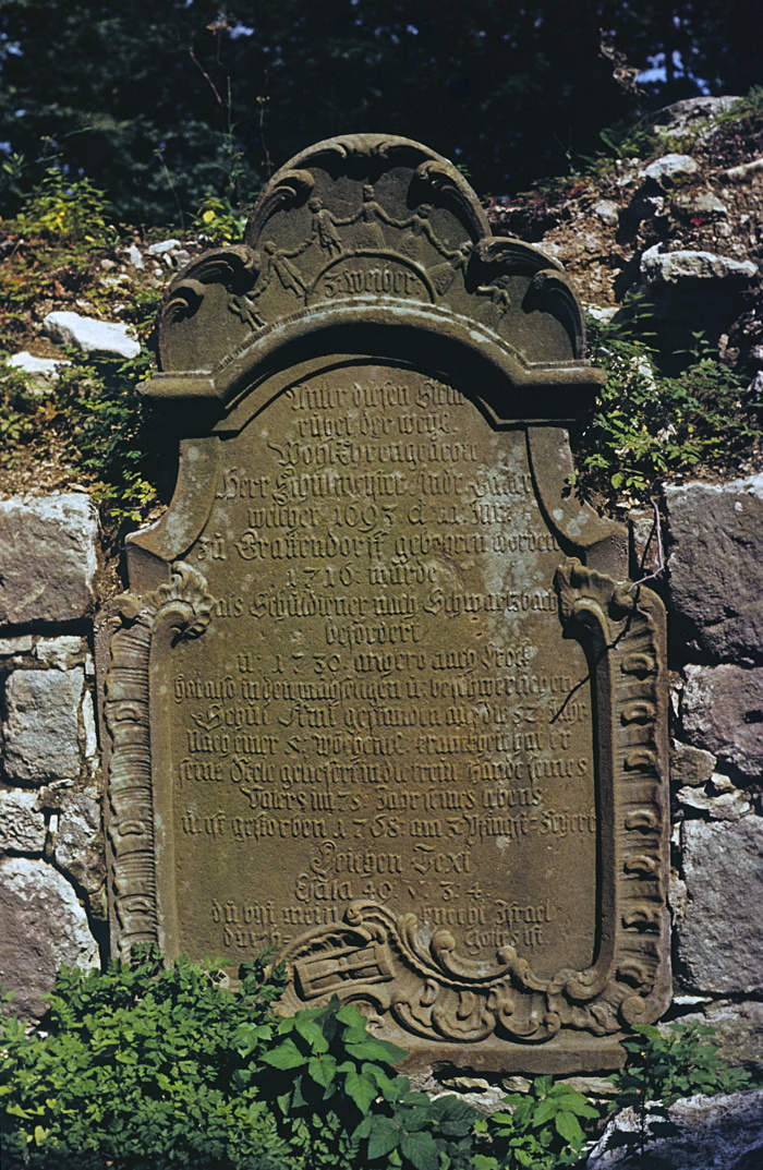 Der Grabstein eines Lehrers, oben deutlich die Inschrift zu erkennen: 3 Weiber.