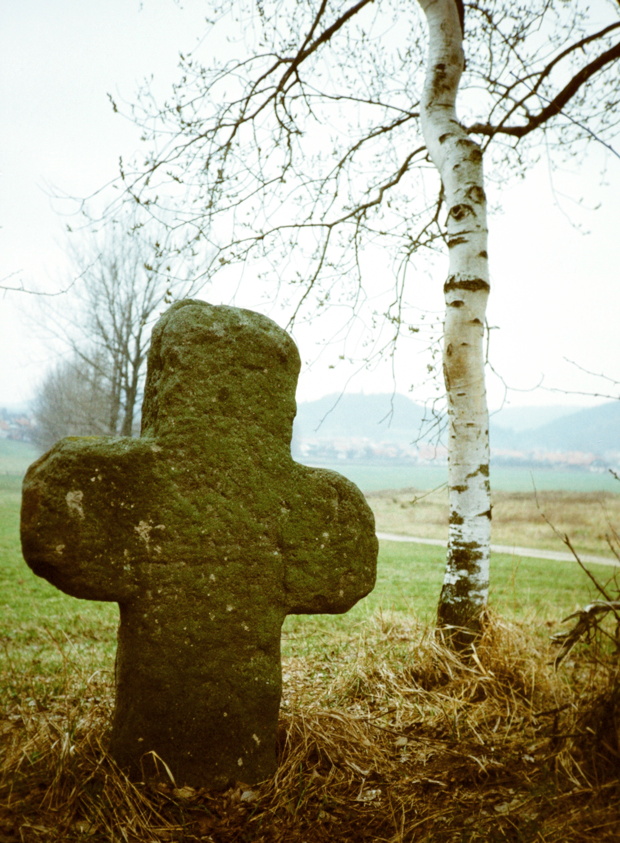 Das alte Wegekreuz an der Handelsstraße Hamburg-Vendig in Crock. Im Hintergrund der Irmelsberg mit Kirchturmspitze.