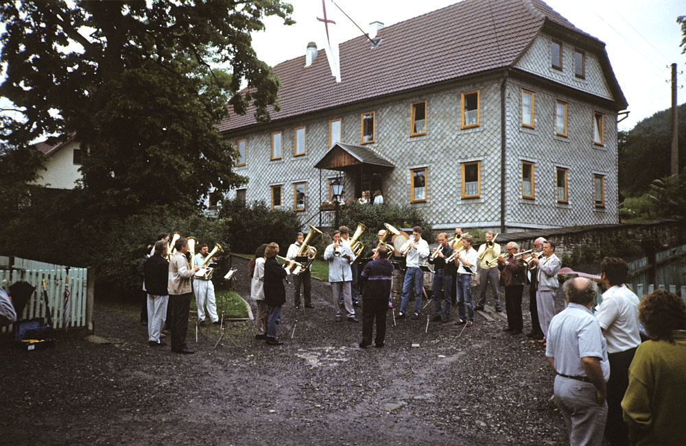 Der Wuppertaler Posaunenchor beim „Wecken“ vor dem Pfarrhaus 1988.