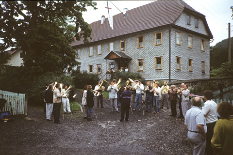 Zu Kirchfesten wurde schon früh der Pfarrer mit einem Ständchen „geweckt“. Hier die Wuppertaler Blasmusik, die wir mit vielen Schwierigkeiten nach Crock geholt haben.