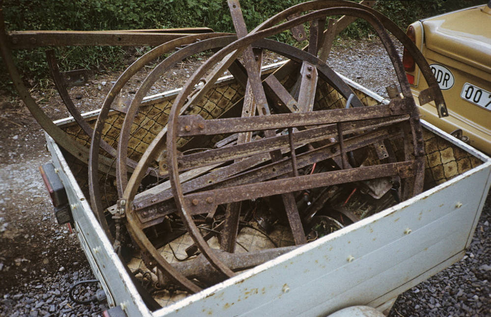 Die alte elektrische Läuteanlage wird zum Schrottplatz mit dem Dienstwagen des Ortspfarrers gefahren.
