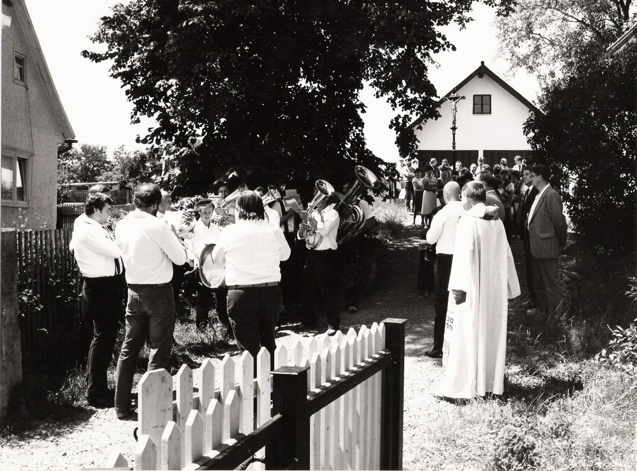 Der Zug zur Kirche beginnt immer am Pfarrhaus, 1985.