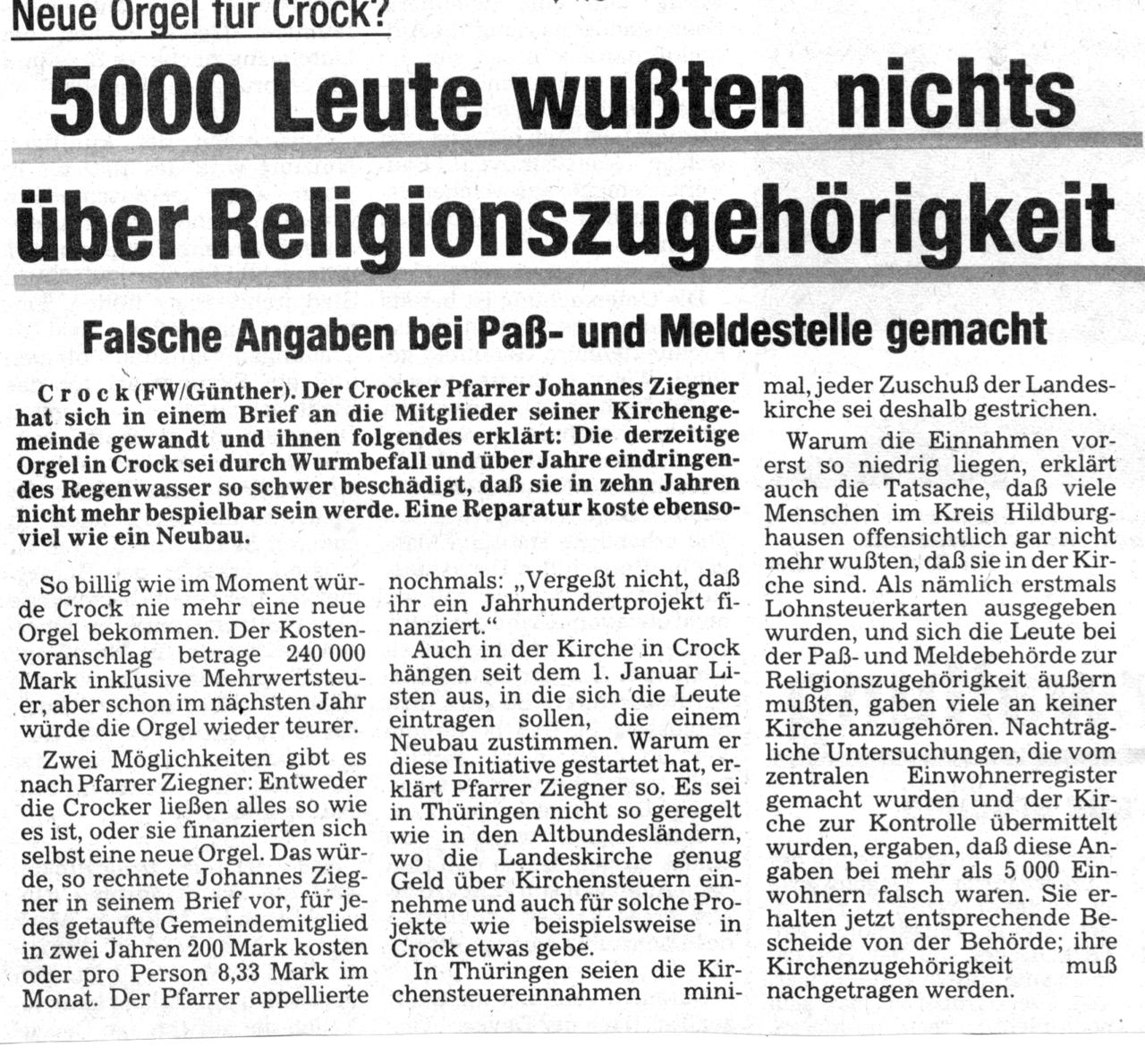 Kirchgemeinde Crock in der Zeitung 1992