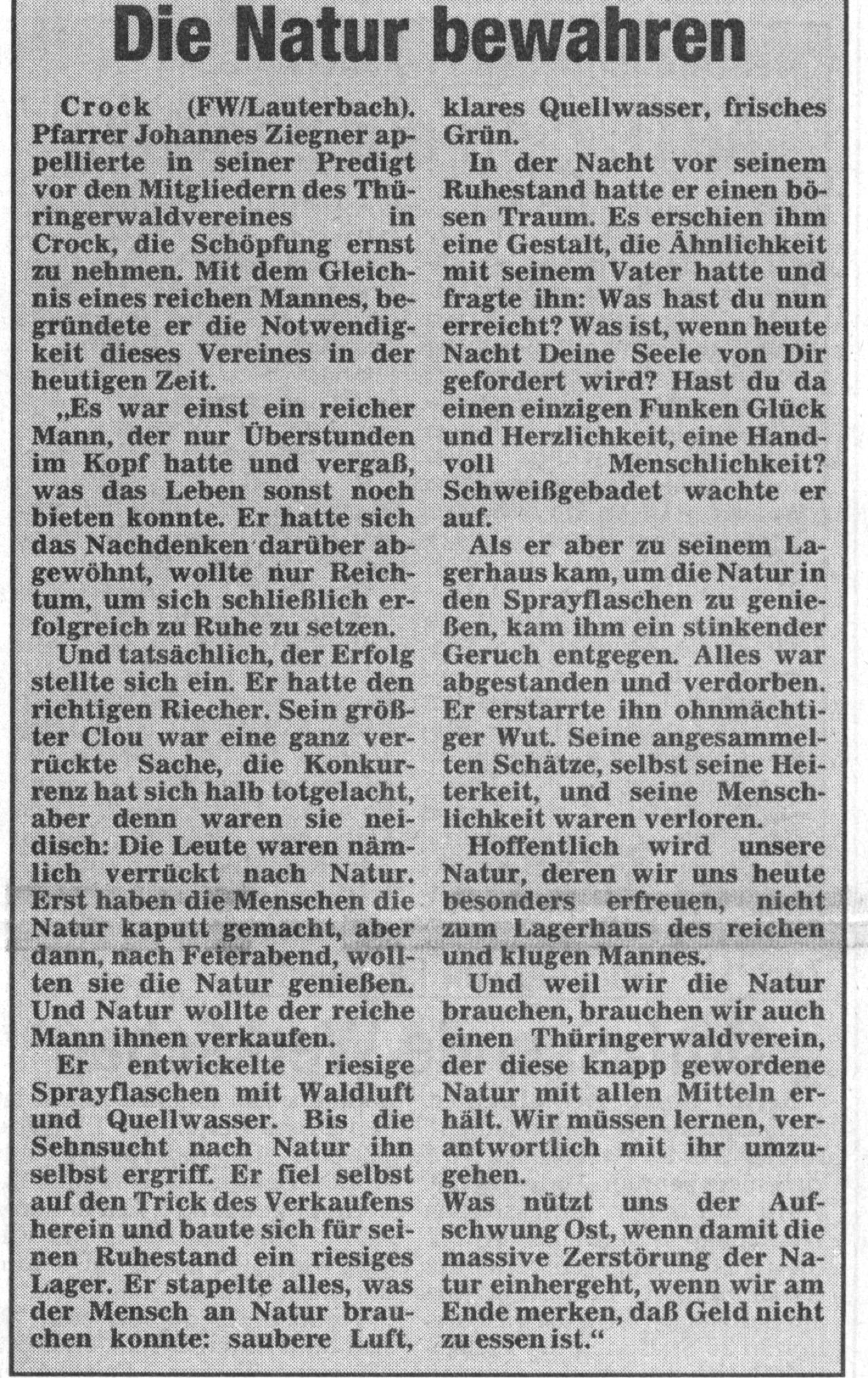 Kirchgemeinde Crock in der Zeitung 1992
